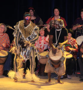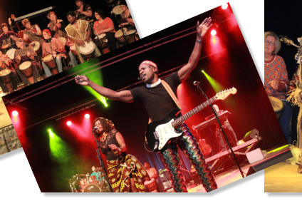 Traditionelle afrikanische Musik wird hauptsächlich durch die Trommeln bestimmt.Die Trommel, früher das einzige schnelle Kommunikationsmittel über große Distanzen hinweg,ist als Instrument in ihrer Klangfarbe unendlich variantenreich - man muss sie nur richtig schlagenkönnen...Traditionell afrikanisch ist auch Kleidung aus Naturmaterialien wie Leder, Fell, Gräser (Bast), Blättern und vielem mehr. Deshalb tragen die Musiker für diesen Part auch die Munganza, ein traditionelles Kostüm.